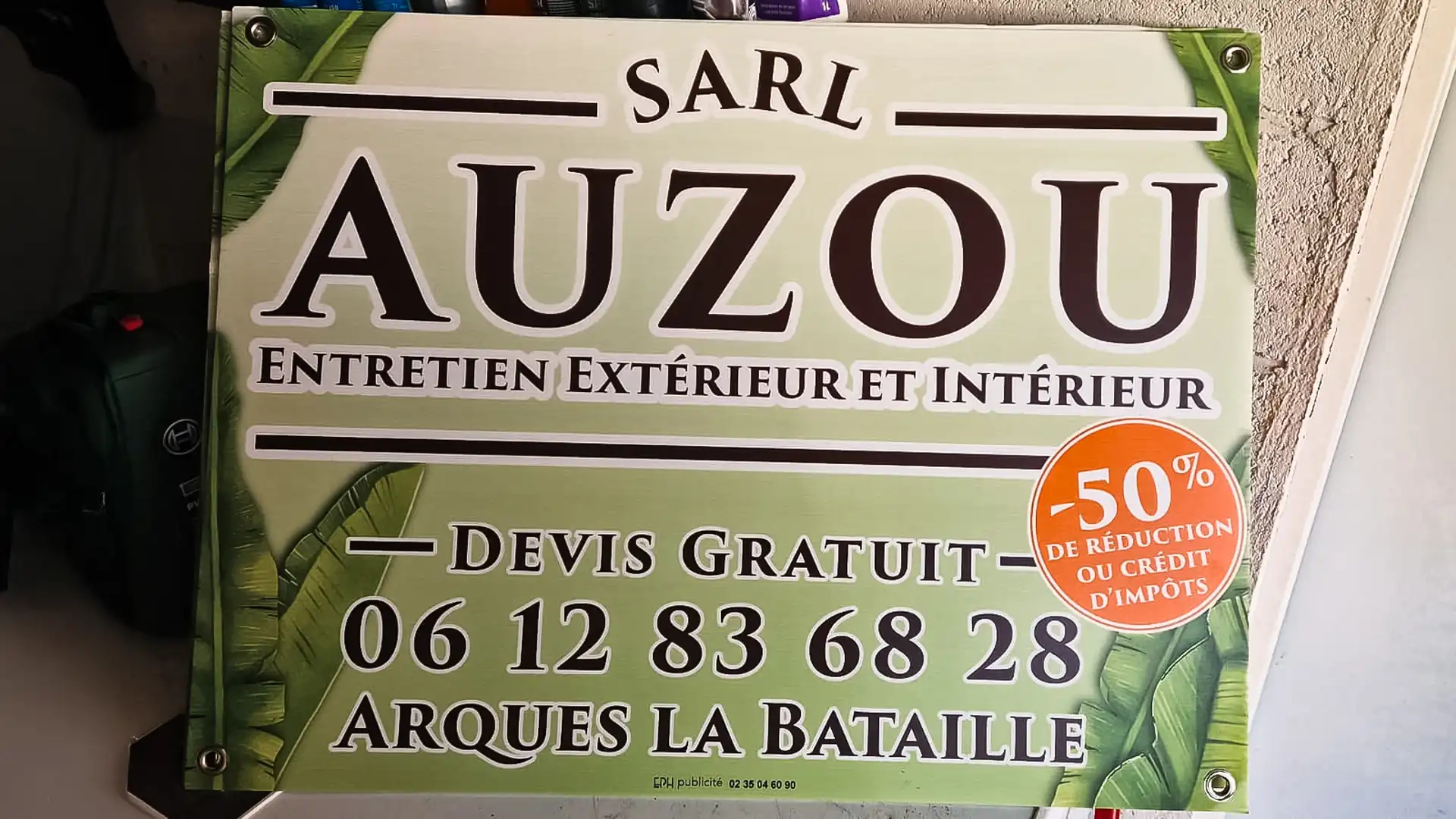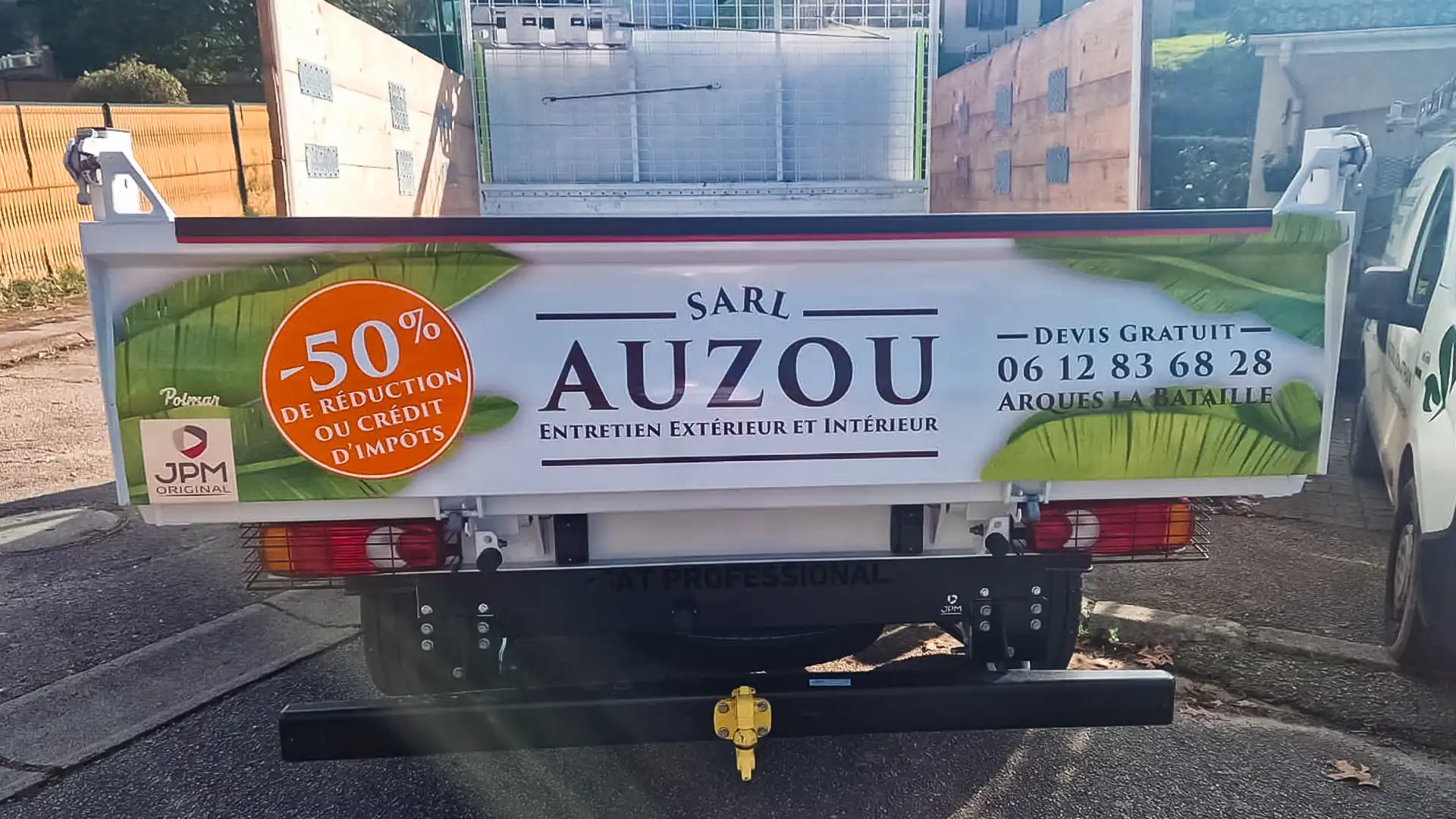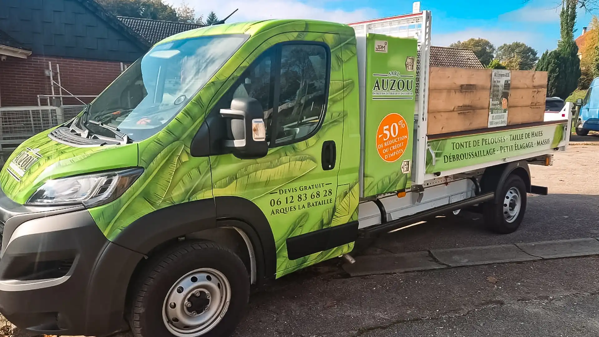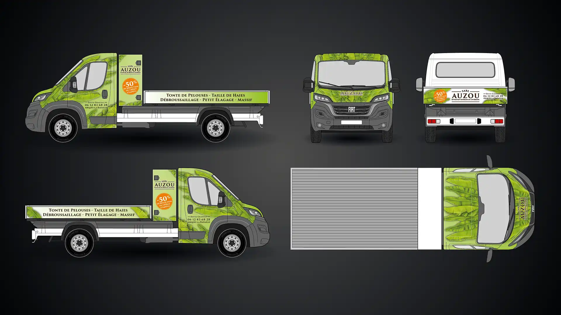 La SARL Auzou souhaitait un design percutant pour son camion benne afin de valoriser ses services d’entretien extérieur. J’ai conçu un full covering sur-mesure aux teintes végétales dynamiques. L’équipe d’EPH s’est chargée de la pose, pour un rendu final impactant et professionnel.